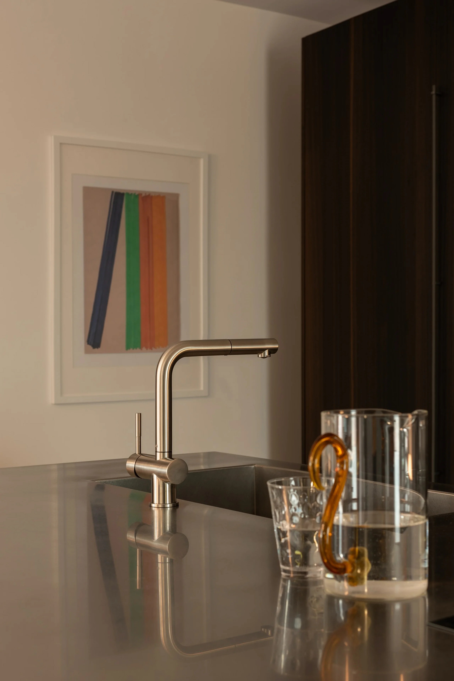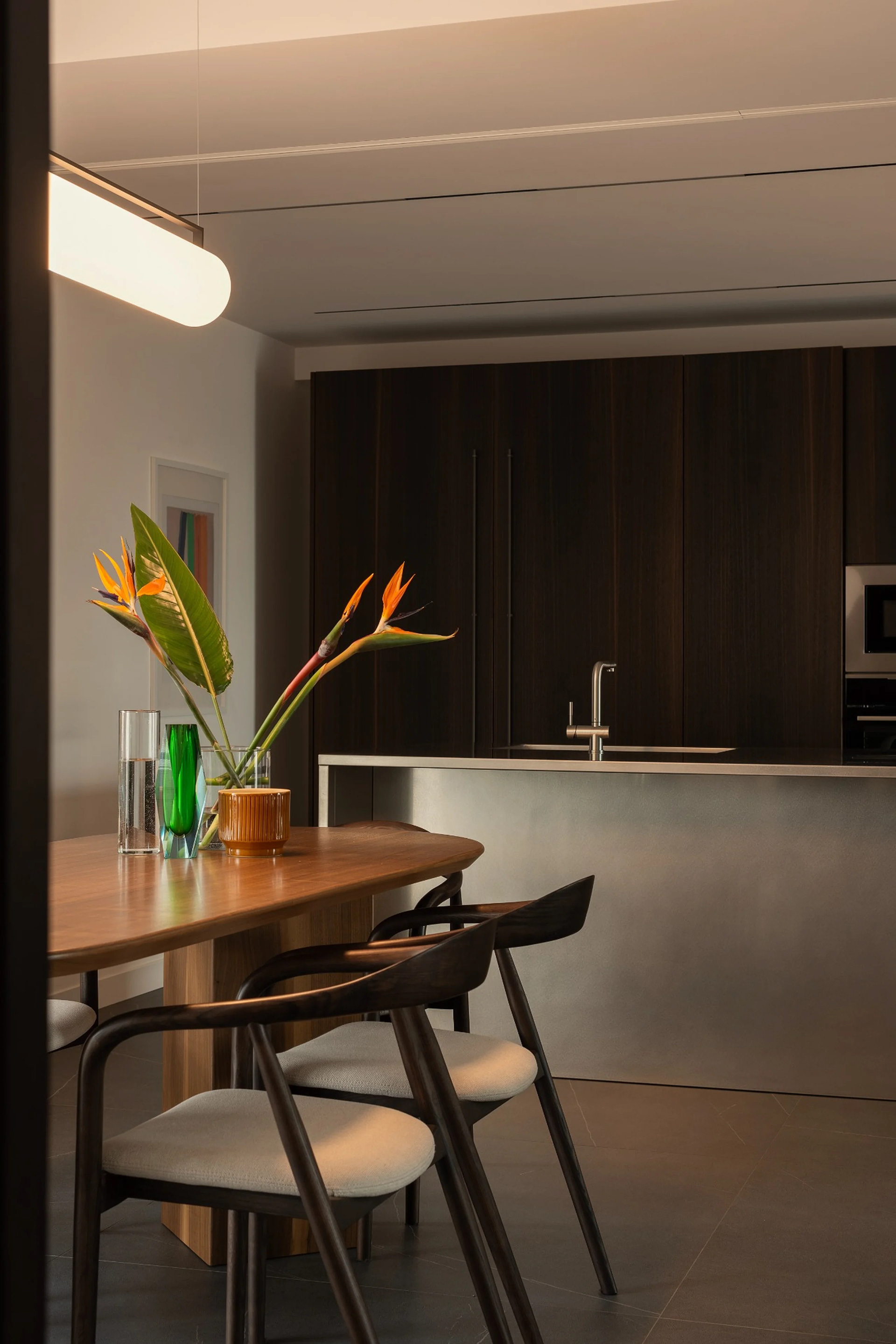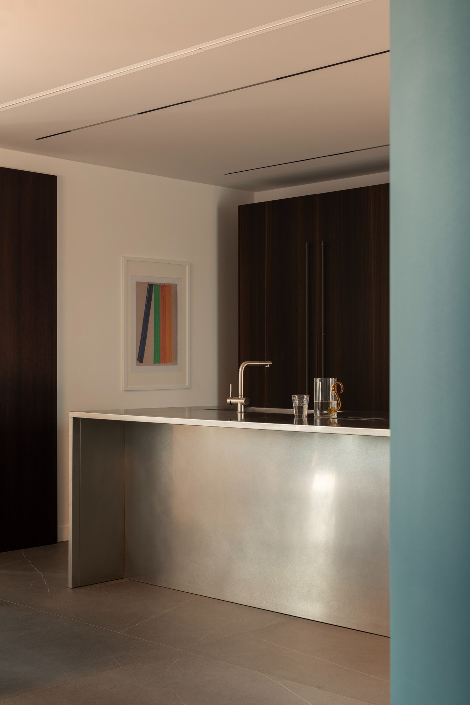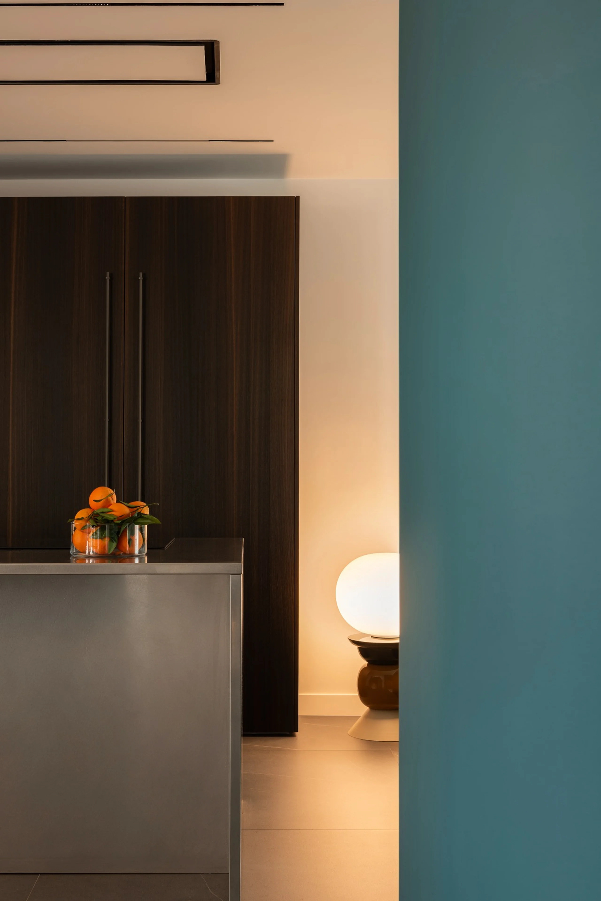 Il fulcro della casa è la cucina con isola in acciaio satinato, pensata come elemento architettonico oltre che funzionale, attorno al quale si organizzano living e zona pranzo. Le superfici materiche, i legni scuri e i toni neutri sono bilanciati da un segno cromatico deciso che diventa riferimento visivo e orientamento spaziale.