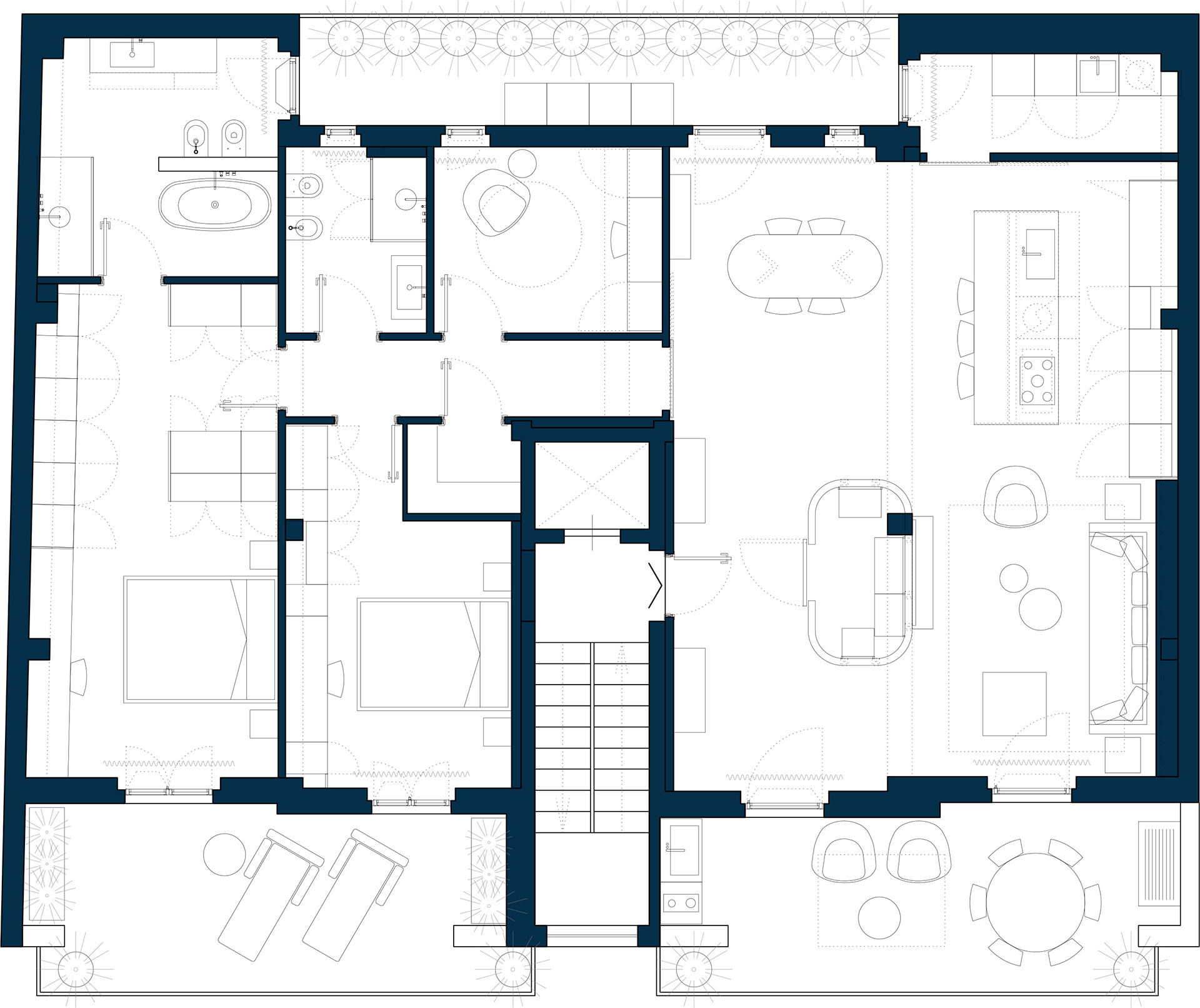 L’intervento di interior design nasce dalla volontà di eliminare la rigidità distributiva originaria, trasformando la zona giorno in un ambiente aperto e permeabile, capace di accompagnare i diversi momenti della quotidianità.