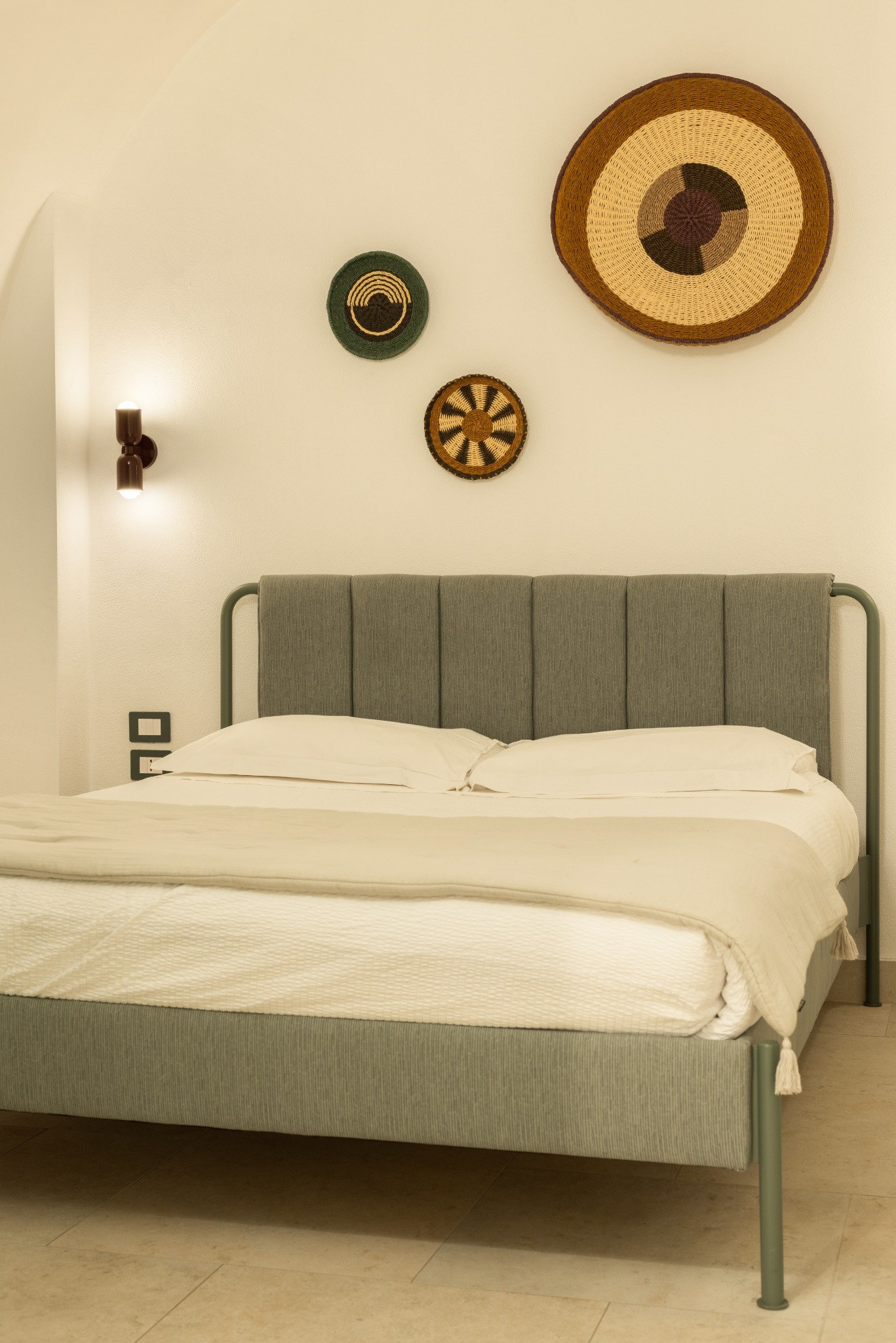La palette cromatica, composta da beige naturali, tonalità sabbia e accenti mediterranei, amplifica la luce e rafforza l’identità dell’intervento.