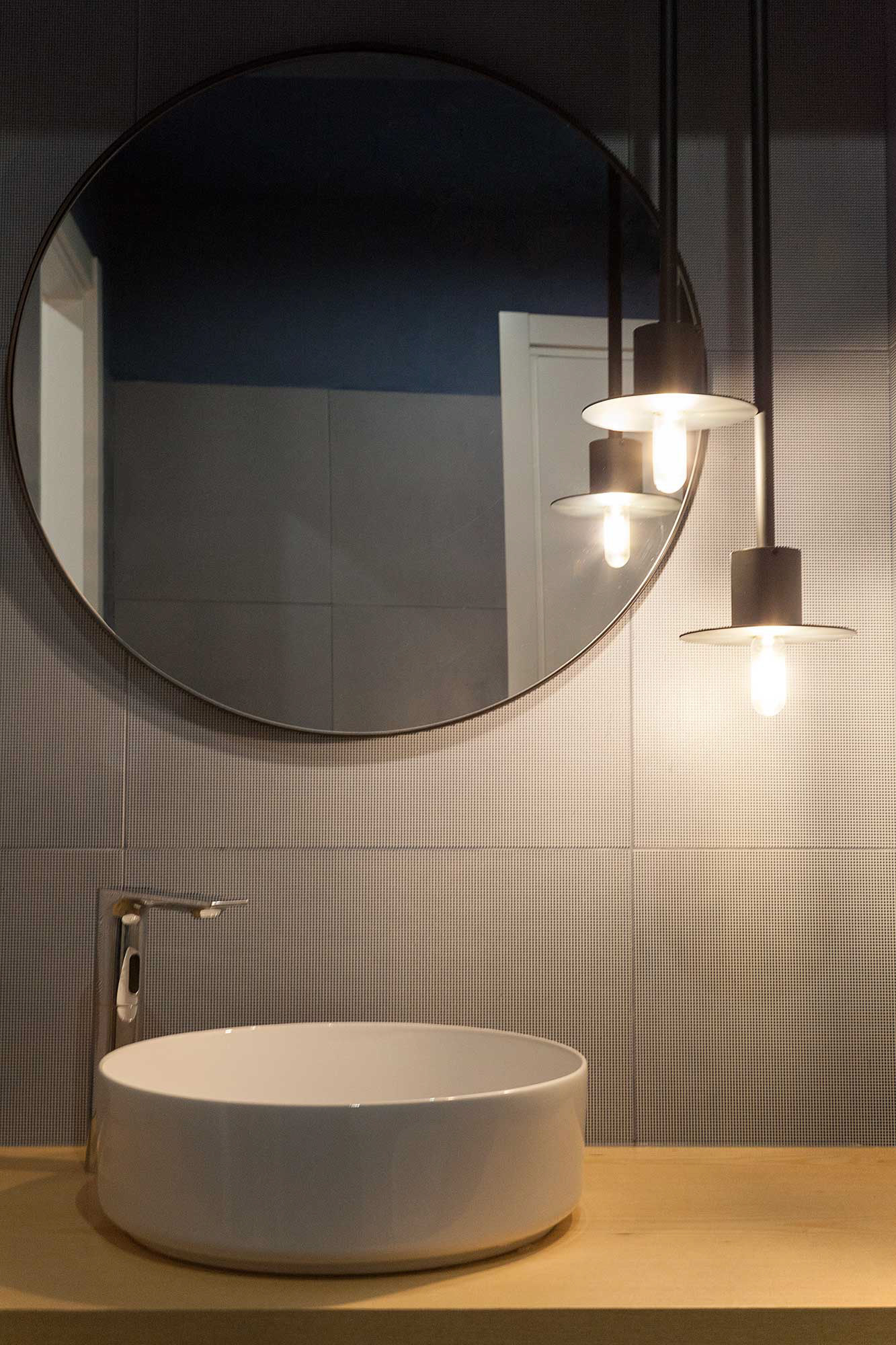 L’illuminazione assume un ruolo centrale nella percezione dell’ambiente, alternando luce tecnica e accenti luminosi decorativi che rafforzano il carattere contemporaneo del locale.