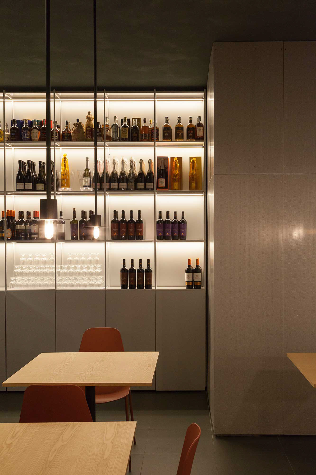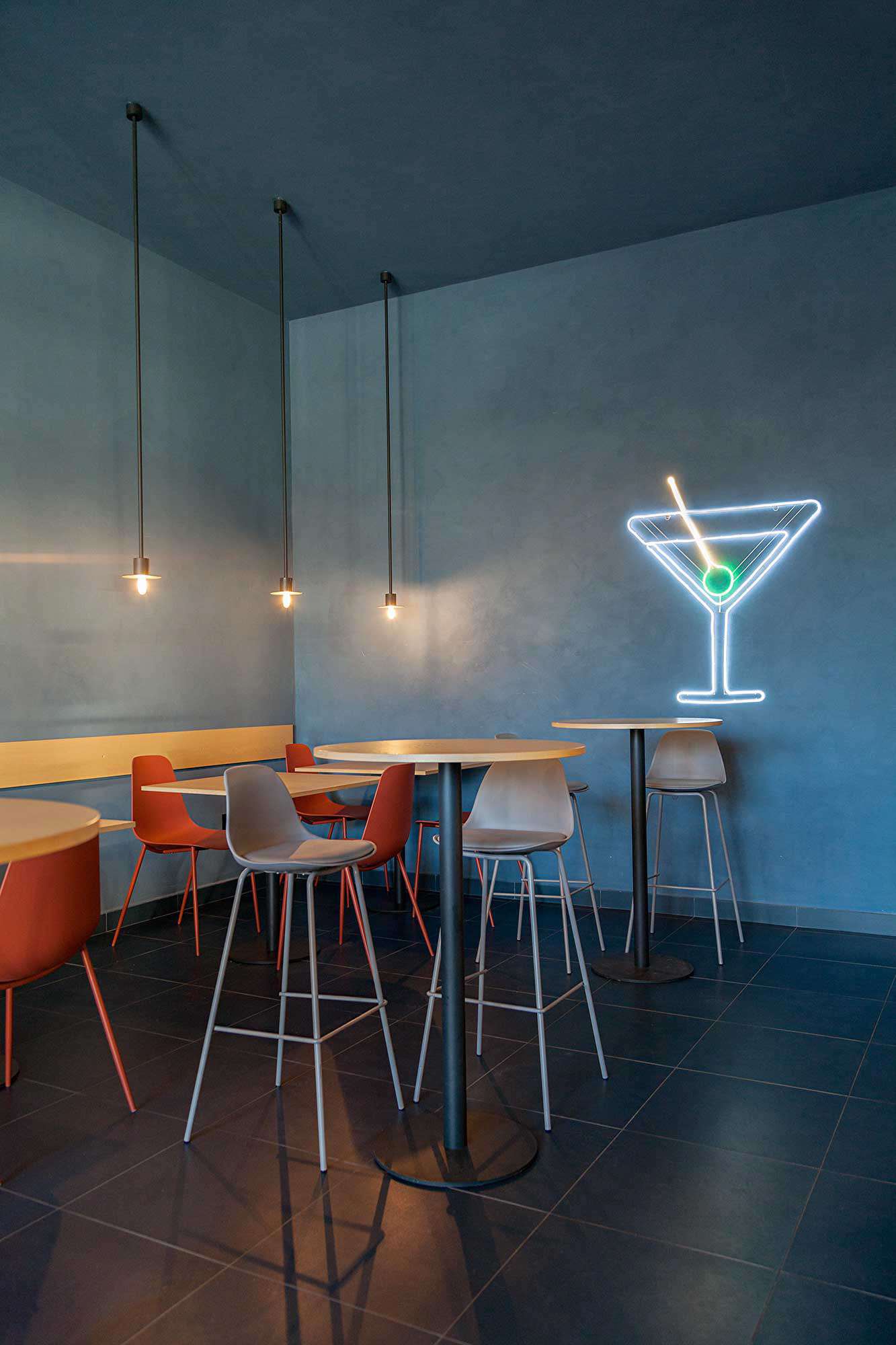 L’intervento ha riguardato la definizione completa dell’identità spaziale del locale, attraverso un linguaggio architettonico essenziale caratterizzato da superfici materiche, illuminazione scenografica e una palette cromatica intensa capace di costruire un’atmosfera riconoscibile.